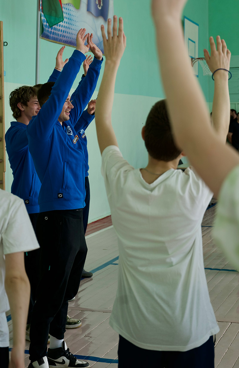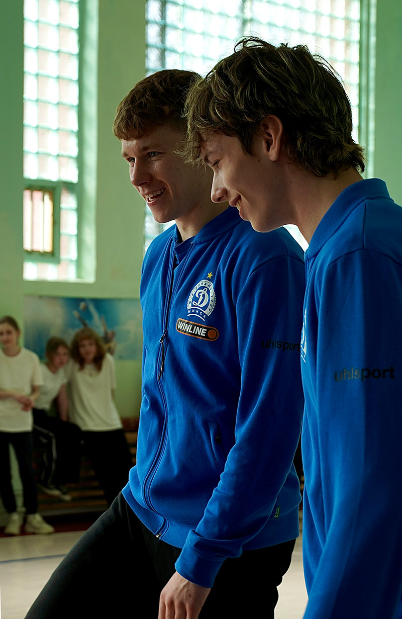 Дарэчы, выпускніком гэтай установы адукацыі, размешчанай у мікрараёне Паўднёвы Захад, з’яўляецца хаўбек Яўген МАЛАШЭВІЧ. І прыехаў туды з Ягорам МОЎЧАНАМ, Уладзіславам ПОЛАЗАМ і Арцёмам САКАЛОЎСКІМ, каб правесці ўрок фізкультуры для навучэнцаў 6-х класаў. У праграме былі актыўная размінка, практыкаванні на дрыблінг, кантроль і перадачы мяча, сяброўскі міні-футбольны паядынак.